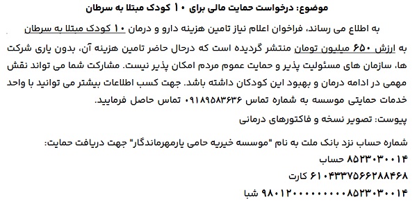 درخواست حمایت مالی، برای ۱۰ کودک مبتلا به سرطان ۰۷ بهمن ۱۴۰۴ | ۱۱:۳۳ کد : ۵۷۷۳۲ اطلاعیه ارسال به دیگران نام شما ایمیل شما ایمیل دریافتکننده ارسال انصراف تعداد بازدید:۹۷ موسسه خیریه حامی یار، درخواست حمایت مالی، برای ۱۰ کودک مبتلا به سرطان را دارد.